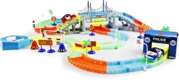 Im Set enthalten ist ein LED-Auto (rot oder blau), das während der Fahrt leuchtet und einen eindrucksvollen Lichteffekt hinterlässt. Für die Spielwelt sorgen Polizeistation, Verkehrszeichen und Tankstelle, damit Kinder Fantasie und Rollenspiel ausleben können.