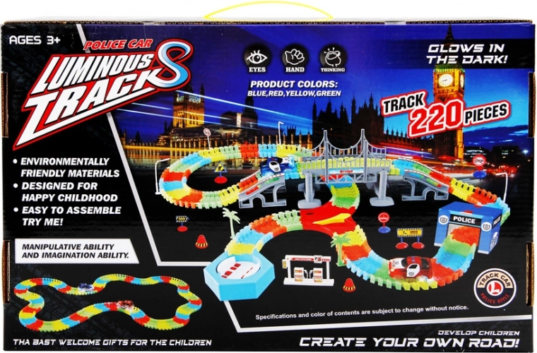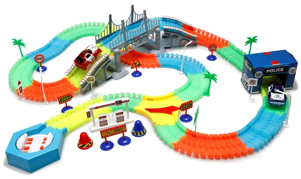 Die leuchtende Rennstrecke mit 220 flexiblen Teilen bietet kreativen Bau- und Rennspaß – auch im Dunkeln. Die Teile lassen sich einfach ineinanderklicken, sodass Sie Geraden, Kurven und Brückenabschnitte gestalten und die gesamte Strecke im Handumdrehen verändern können.