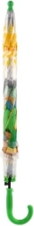 Fröhlicher Kinder-Regenschirm mit transparenter Kuppel und bunten Dinosauriermotiven, der regnerische Tage in Spaß verwandelt. Dank automatischer Öffnung, leichtem Gestell und bequemen grünen Griff ist er einfach zu bedienen und liegt gut in Kinderhänden.