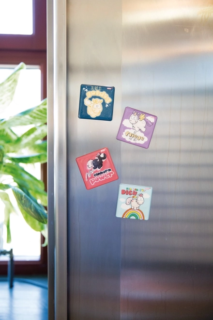 Ein Set von vier dekorativen Magneten mit Einhorn-Motiven, die jede Metalloberfläche in Ihrem Zuhause oder Büro beleben. Ideal zum Befestigen von Notizen, Fotos oder Kinderzeichnungen.