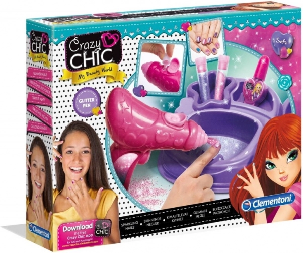 Das Crazy Chic Set bietet alles, was kleine Stylistinnen für schön gepflegte Nägel brauchen. Lack auftragen, den Glitzerstift verwenden – und im Handumdrehen entstehen glänzende, farbenfrohe und ausdrucksstarke Verzierungen. Die intuitive Station hält sämtliches Zubehör an seinem Platz und macht den gesamten Prozess angenehmer.