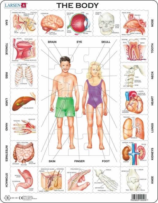 Bringen Sie Kindern die Funktionsweise des menschlichen Körpers mit dem Lernpuzzle LARSEN näher. Nach dem Zusammensetzen erhalten sie eine anschauliche Übersicht über Organsysteme und Körperteile, die natürliches Lernen durch Spiel unterstützt. Jedes Puzzleteil hat eine einzigartige Form und passt nur an seinen Platz, was die Konzentration erhöht und zur Fertigstellung motiviert.