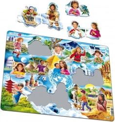 Begeben Sie sich mit dem LARSEN Puzzle auf eine Reise über die Kontinente, bei der Kinder Freundinnen und Freunde aus Ägypten, Deutschland, Italien, China und weiteren Ländern kennenlernen. Durch die unregelmäßigen Teile ohne klassische Verzahnungen ist das Puzzeln intuitiv und macht Spaß – als wäre das Bild in einzigartige Stücke „zersprungen“.
