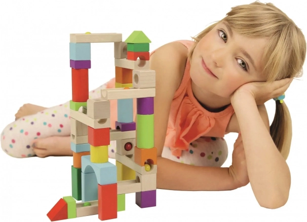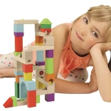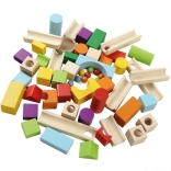 Das Set aus bunten Holzblöcken und Bahnen ermöglicht unendliche Konstruktionsmöglichkeiten und entwickelt die Feinmotorik und Kreativität.
