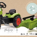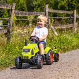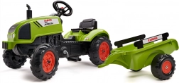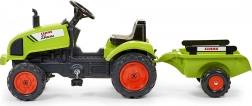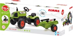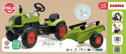 Trettraktor Claas Arion 410 mit Anhänger, mit aufklappbarer Motorhaube, Auspuff, Lenkrad und Hupe. Aus hochwertigem, sehr widerstandsfähigem Kunststoff. Größe 138 × 53 × 42 cm. Alter 2+. Alle Falk-Traktoren sind gemäß den Anforderungen europäischer Normen bis 30 kg getestet. Hergestellt in Frankreich.