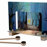 Das Theater enthält fünf Figuren (Hänsel, Gretel, die Hexe, der Vater und die Katze), die sich mithilfe von unter der Szene geführten Magnetstäbchen über die Bühne bewegen. Die Kulissen lassen sich nach Belieben austauschen und schaffen immer neue Bühnenbilder – vom dunklen Wald bis zum gemütlichen Häuschen.