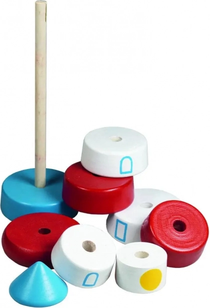 Das Aufstecken auf den Stab trainiert die Augen–Hand-Koordination, das Sortieren nach Form und Größe sowie die Farbwahrnehmung. Das ideale erste didaktische Spielzeug für die Kleinsten.