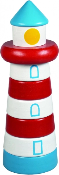 Der hölzerne Leuchtturm als Stapelpyramide lädt Kinder dazu ein, die einzelnen Teile entsprechend Form und Größe auf den Stab zu stecken. Das Spiel unterstützt intuitiv die Augen–Hand-Koordination, die Geduld sowie die Wahrnehmung von Farben und Formen und stimuliert dank der glatten Oberfläche angenehm den Tastsinn.