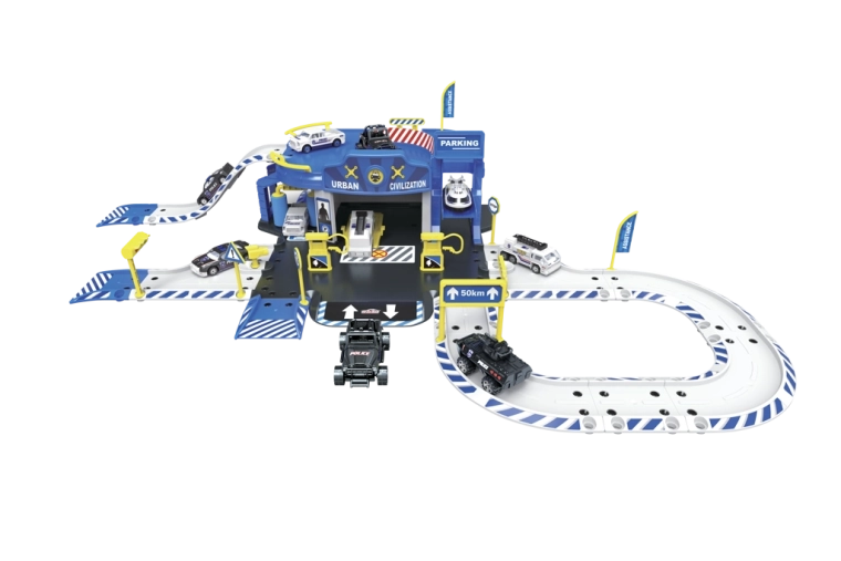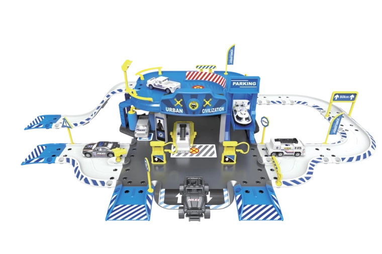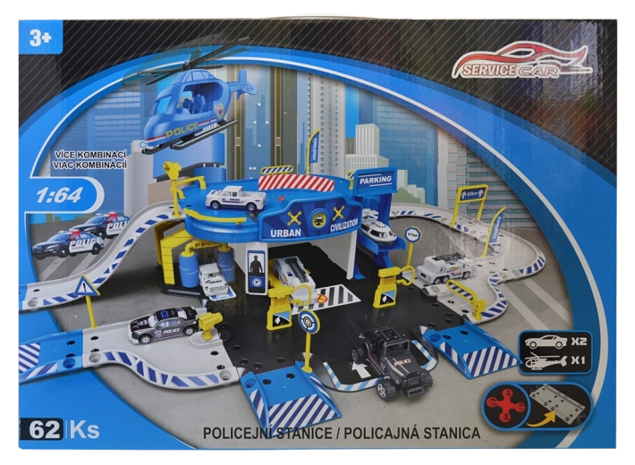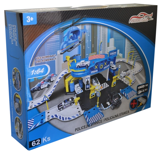 Polizeistation-Garage mit Zubehör (Set mit 62 Teilen) Abmessungen der Garage nach dem Aufbauen: 83,2 × 45,2 × 20 cm Inhalt des Sets: Polizeistation mit Garage, Metallmodell-Autos 1:64 (6 Stück) und Hubschrauber
