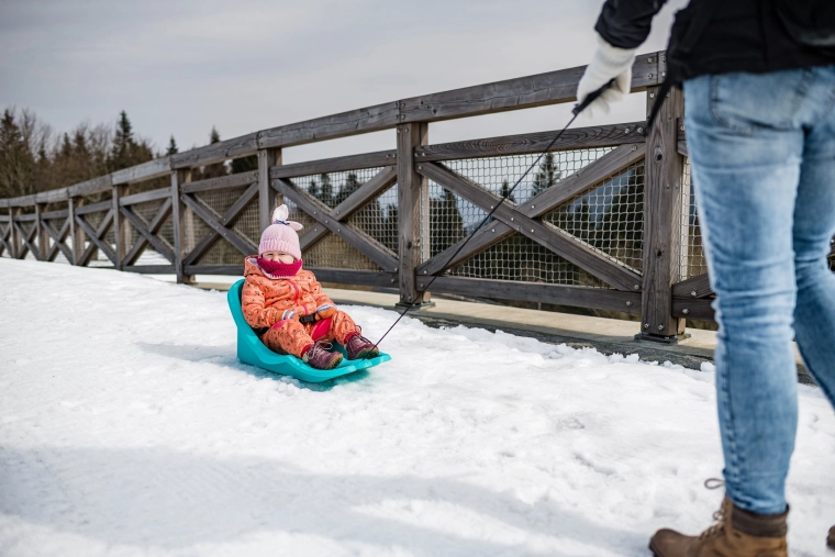 Die praktische Zugleine mit Griff ermöglicht es Eltern, den Bob auch auf längeren Strecken mühelos durch den Schnee zu ziehen.