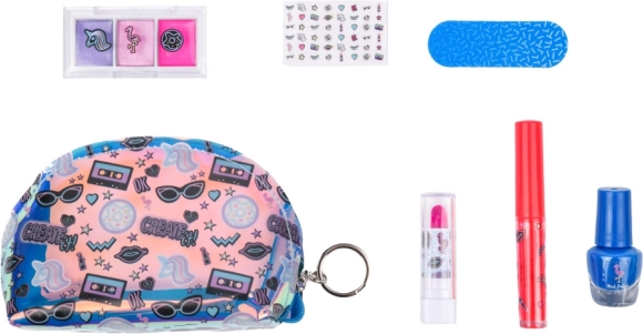 Das Set umfasst 3× Lidschatten für dezentes oder auffälligeres Make-up, einen Nagellack mit Stickern für originelle Deko, einen Lipgloss und einen Lippenstift für das perfekte Finish sowie eine praktische Feile. Dank der kompakten Maße ideal für Ausflüge, zur Oma oder für die Schultasche.