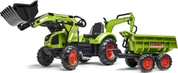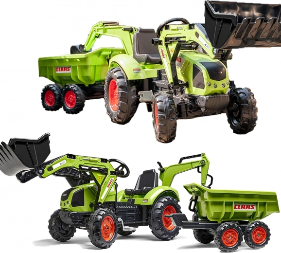 Trettraktor Claas Arion 430 grün mit funktionaler vorderer und hinterer Schaufel, vierrädrigem Anhänger, drehbarem Sitz, aufklappbarer Motorhaube und Hupe. Aus hochwertigem, äußerst widerstandsfähigem Kunststoff. Größe 2200×58×70 cm. Alter 3+. Alle Falk-Traktoren sind gemäß den Anforderungen europäischer Normen bis 50 kg getestet. Hergestellt in Frankreich.