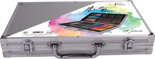 Das Set umfasst 79 Teile, darunter Wasserfarben, Buntstifte, Pinsel, Radiergummi und Anspitzer für sämtliche künstlerischen Bedürfnisse.