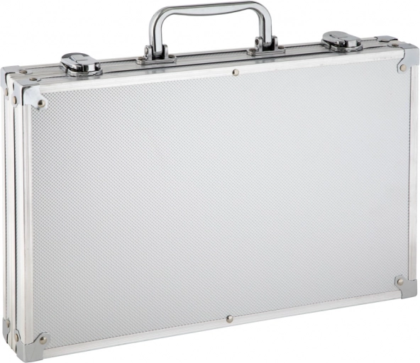 Dieser Metallkoffer ist mit einem stabilen Griff und sicheren Verschlüssen ausgestattet, was ein einfaches Transportieren und eine sichere Organisation aller Materialien ermöglicht.