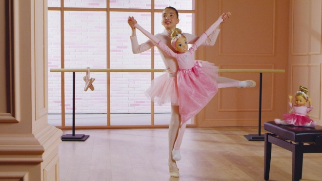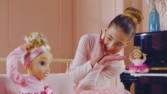 Das Spielzeug unterstützt Kinder beim Balletttraining durch die Möglichkeit der Interaktion mit der Figur im Tanzstudio. Das Mädchen auf dem Bild und Ballerina Molly demonstrieren echte Ballettpositionen.