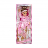 Ballerina Molly trägt ein bezauberndes rosafarbenes Kleid mit passendem Haarband und einer eleganten Duttfrisur. Ihr Gesicht ist fein ausgearbeitet, mit großen Augen, die ihren eleganten Look unterstreichen.