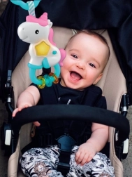 Das niedliche Einhorn von Baby Clementoni ist der ideale Begleiter für zuhause und unterwegs. Es kombiniert Melodien, Lichteffekte und sichere haptische Elemente, die die Neugier Ihres Babys auf natürliche Weise anregen und seine Sinne fördern. Dank der kompakten Maße nehmen Sie es überallhin mit und befestigen es leicht dort, wo Ihr Kind es am besten erreichen kann.