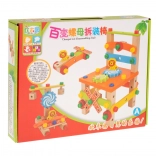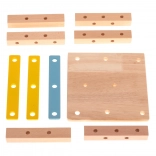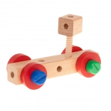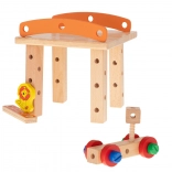 Enthalten sind ein Holzschraubendreher, ein Schlüssel, Schrauben und Muttern – Kinder lernen, Teile korrekt zu verbinden und trainieren die Feinmotorik.