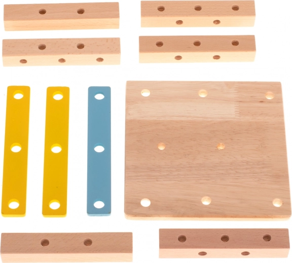 Enthalten sind ein Holzschraubendreher, ein Schlüssel, Schrauben und Muttern – Kinder lernen, Teile korrekt zu verbinden und trainieren die Feinmotorik.