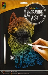 Die schwarze Deckschicht verwandelt sich beim Kratzen in lebendige Regenbogenfarben. Sie gestalten ein detailliertes Katzenmotiv ganz ohne Farben oder Kleber – der beiliegende Stift genügt.