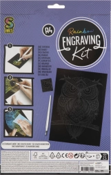 Im Set ist alles enthalten: Bild 25 × 20 cm, Kunststoff-Kratzstift mit Metallspitze sowie eine Testkarte zum Üben von Strichen und Texturen.