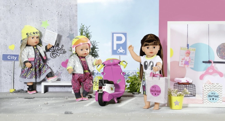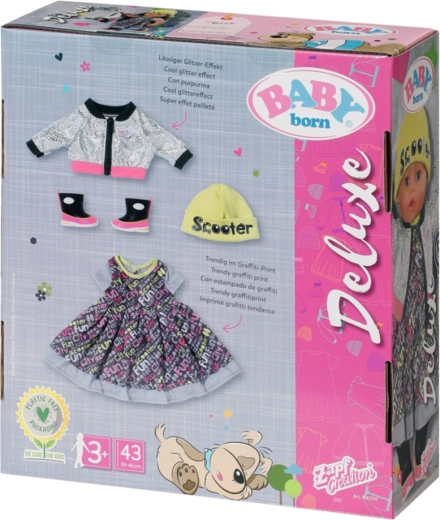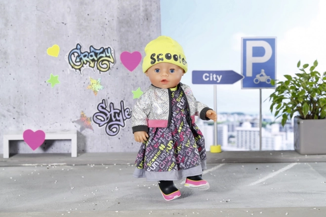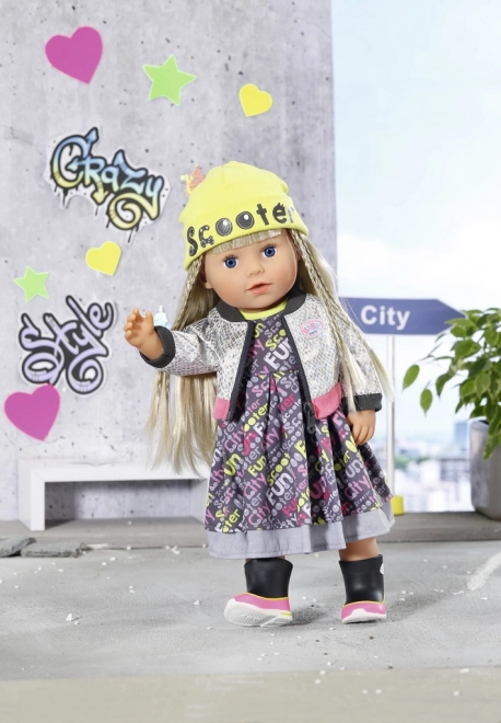 Dank der Lagenkleidung und der gelben Mütze sieht die BABY born Puppe in den belebten Stadtstraßen sehr elegant aus. Als Windschutz trägt sie eine Jacke mit glänzendem Silbermuster. Coole Schuhe in bunten Farben runden das Gesamtbild ab. • Maxikleid im rockigen Look mit Aufdruck. • Moderne Jacke mit Spiegeleffekt. • Mütze in Neonfarben mit dem Schriftzug „Scooter“. • Farblich abgestimmte Schühchen ergänzen das Set perfekt. • Für Puppen mit 43 cm Größe. • Handwäsche in lauwarmem Wasser möglich. Nicht im Trockner trocknen. • Verpackung: plastikfreie Verpackung – Geschenkbox mit Produktbildern.