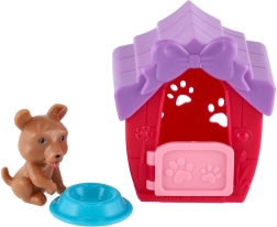 Enthalten sind ein Futternapf und eine Welpenfigur. Das Häuschen ist mit einer Schleife und geprägten Pfötchen verziert, die dem Spiel zusätzlichen Charme verleihen.