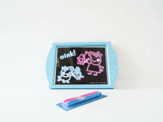 Die leuchtende Zeichentafel Peppa Wutz ist ein großartiges Hilfsmittel für kleine Künstler. Kinder malen mit Neon-Markern auf die transparente Fläche und beim Einschalten erstrahlen ihre Werke. Kreativer Spaß, der Fantasie, Feinmotorik und Geduld fördert.