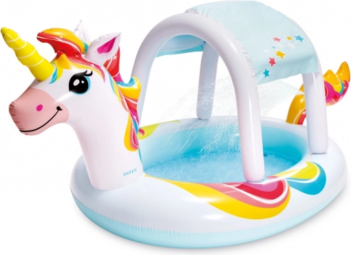 Das niedliche aufblasbare Planschbecken in Einhornform sorgt für stundenlangen Sommerspaß. Dank integriertem Wassersprüher und farbigem Baldachin bietet es Erfrischung und teilweise Schatten. Aus hochwertigem Vinyl gefertigt, hat es ein Fassungsvermögen von bis zu 130 l, die Maße 2,54 × 1,32 × 1,09 m und ist geeignet für Kinder ab 2 Jahren. Eine Reparaturflicken ist im Lieferumfang enthalten.