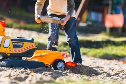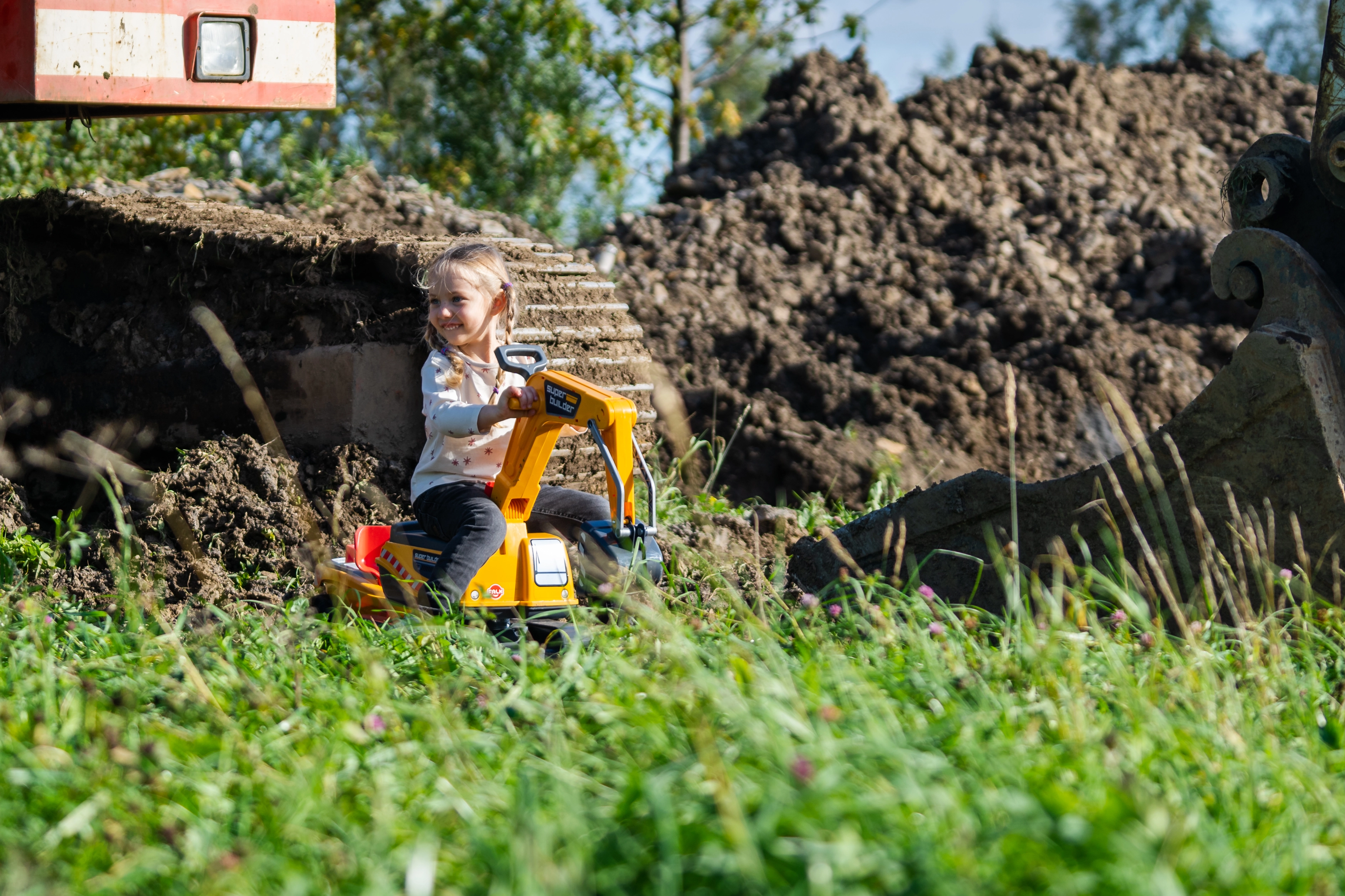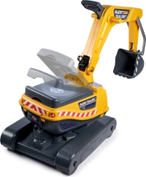 Rutscher Super Kettenbagger in Orange mit funktionsfähiger Schaufel, Kettenimitation, Anhänger und Sandspiel-Set – 2× Sandförmchen in Ziegelform, Schaufel und Harke. Aus hochwertigem und strapazierfähigem Kunststoff. Größe 85×38×67 cm. Alter 3+. Alle Falk-Traktoren sind bis 50 kg getestet – gemäß den Anforderungen europäischer Normen. Hergestellt in Frankreich.