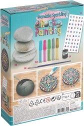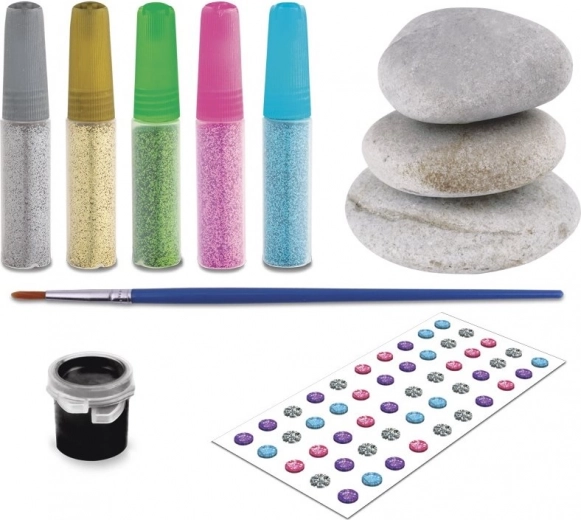 Drei natürliche glatte Steine, ein Pinsel, schwarze Farbe, fünf Metallic-Töne und glitzernde Steinchen – legen Sie direkt nach dem Auspacken los.