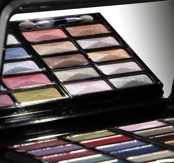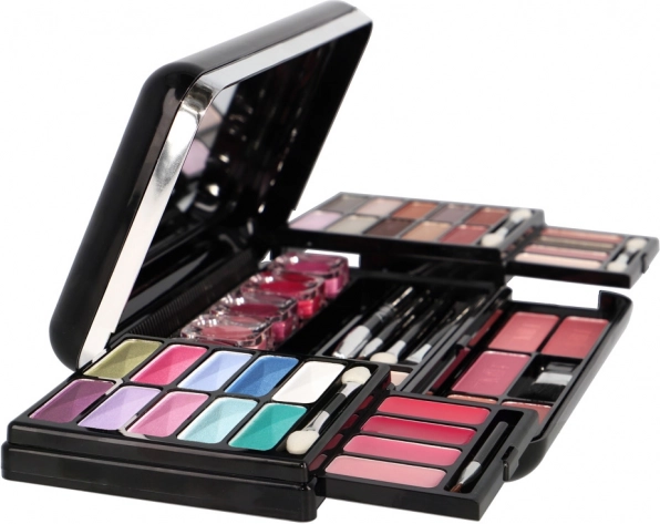 Das elegante schwarze Etui mit Spiegel beherbergt ein komplettes Set für Augen-, Wangen- und Lippen-Make-up – ideal für unterwegs und den täglichen Gebrauch.