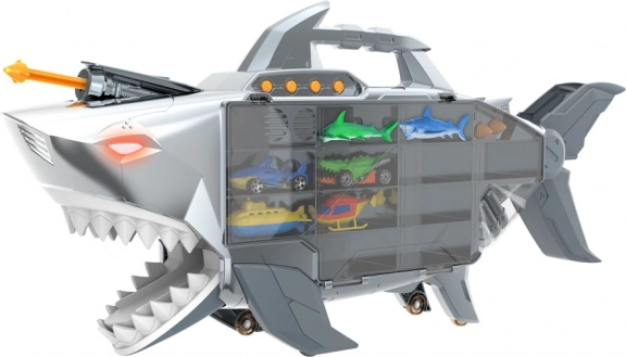 Dieser robuste Hai-Transporter verwandelt das Zimmer in Meeresrennen und Rettungsaktionen. Innen finden Sie übersichtliche Fächer für die Sammlung und Action-Elemente, die jeder Fahrt Spannung verleihen. Kinder schätzen Licht- und Soundeffekte, das aufklappbare Maul und die integrierte Rennrampe.