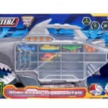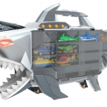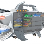 Im Inneren des Hais befinden sich praktische Fächer für bis zu 24 Fahrzeuge. Das aufklappbare Maul dient als Action-Ausfahrt für einen Blitzstart.