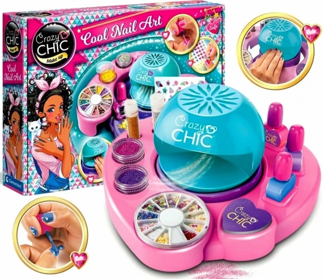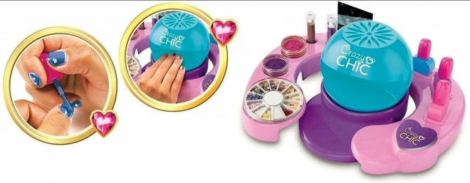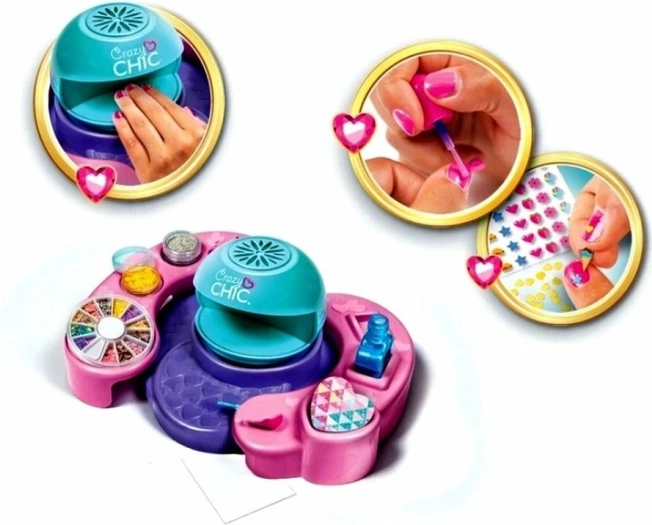 Mit dem CRAZY CHIC Kinderset gestalten Ihre Kinder ihre eigenen Nageldesigns einfach und mit Spaß. Die praktische Basis mit Fächern hält sämtliches Zubehör zusammen und der integrierte Nageltrockner verkürzt die Wartezeit bis zum Trocknen.
