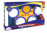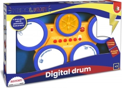 Digitale Trommeln – 4 Trommeln mit 12 voreingestellten Perkussionsinstrumenten, 6 Musikstilen (Demo-Songs), einstellbarer Geschwindigkeit, Lautstärkeregler und rhythmischer LED-Hintergrundbeleuchtung. Betrieb mit Batterien 3× R6/AA 1,5 V. Abmessungen 39×25×6,5 cm.