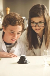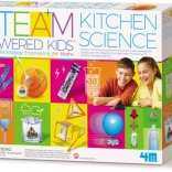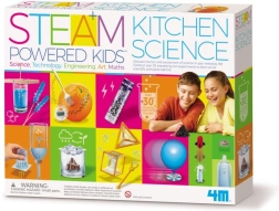 Das Set 4M Kitchen Science bietet pfiffige und sichere Experimente, die Kinder Schritt für Schritt mit Zutaten durchführen, die man zu Hause findet – Essig, Natron, Zitrone, Salz oder Kartoffeln. Lernen wird zum Spiel: Aus Zitrusfrüchten entstehen elektrisch betriebene Uhren, Natron und Essig demonstrieren einen Vulkanausbruch und einfache Vorrichtungen zeigen die Grundlagen von Physik und Chemie.