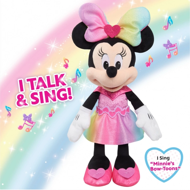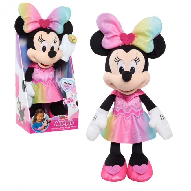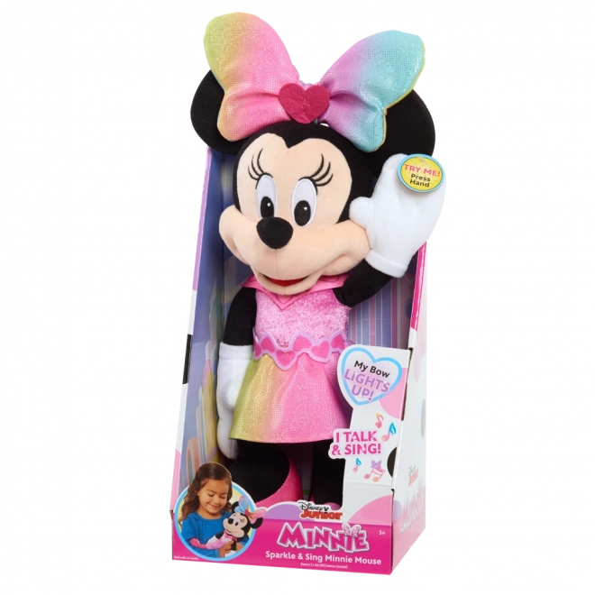 Erleben Sie den Zauber der sprechenden Minnie Maus Plüschfigur, die in einem funkelnden Outfit erscheint! Diese bezaubernde Figur singt das Lied „Minnie's Bow-Toon Are Waiting for You!“ und lässt Kinder singen und tanzen.