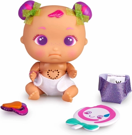 Im Set finden Sie eine weiße und eine glitzernde Windel, einen Schnuller sowie eine Flasche oder einen Lutscher – alles für fantasievolles, abwechslungsreiches Spiel.