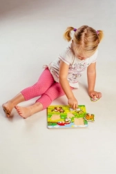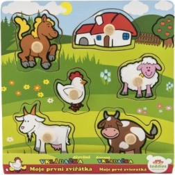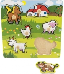 Das Steckspiel hilft Kindern, verschiedene Haustiere wie Pferd, Ziege, Schaf, Huhn und Kuh zu erkennen. Jedes hat seine eigene, einzigartige Form und Farbe.