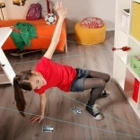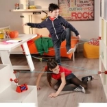Rote Einheiten und Klammern spannen ein Netz blauer „Laser“. Kinder trainieren Beweglichkeit und Koordination und haben dabei Spaß in einer sicheren häuslichen Umgebung.