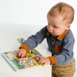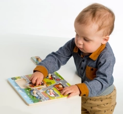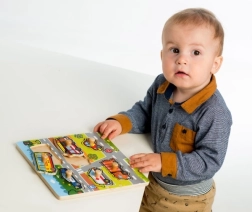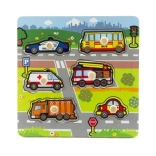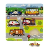 Jedes der sechs Puzzlebilder zeigt ein anderes Verkehrsmittel: Polizeiauto, Bus, Krankenwagen, Feuerwehrauto, Müllwagen und Auto. Das Puzzeln ist dank der Holzunterlage und den Griffen, die die Handhabung erleichtern, einfach.