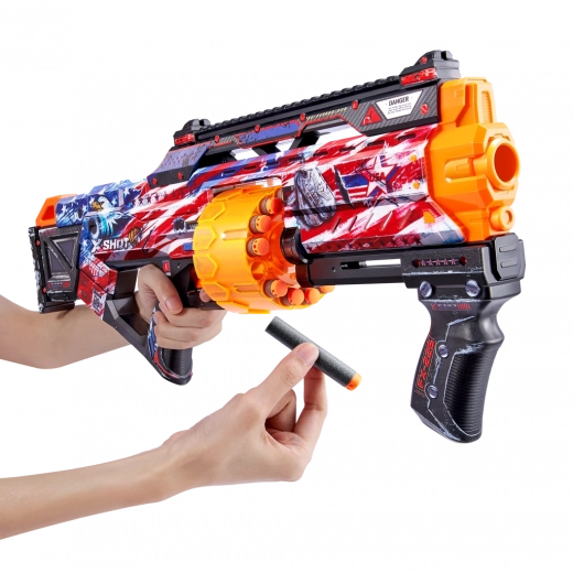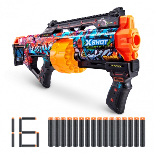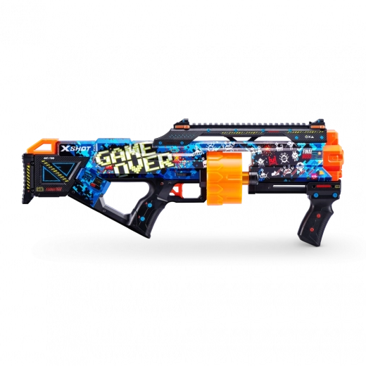 Der X-Shot Skins Last Stand Blaster ist für rasante Outdoor-Gefechte gemacht. Dank der auffälligen Skins-Farbmotive, des ergonomischen Griffs und der robusten Konstruktion aus hochwertigem Kunststoff hält er auch intensives Spielen aus. Das hochkapazitive, drehbare Trommelmagazin ermöglicht flüssiges Nachladen und schnelles Feuern ohne häufige Unterbrechungen.