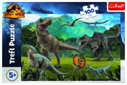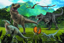 Tyrannosaurus, Velociraptor und Pterosaurier in einer dynamischen Szene aus JURASSIC WORLD motivieren zum wiederholten Puzzeln.
