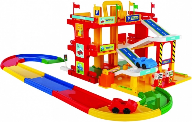 Dreistöckige Garage mit Aufzug, Waschstraße und Tankstelle für ein komplettes Spielerlebnis.