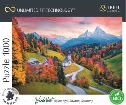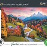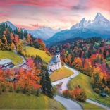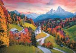 Tauchen Sie ein in die malerische Atmosphäre des Alpenvorlands. Dieses Motiv mit kurviger Landstraße, kleinem Kirchlein und farbenprächtigem Herbstlaub vor schneebedeckten Gipfeln erfreut Auge und Geist. Dank der Unlimited Fit Technology (UFT) lassen sich einzelne Bilder aus derselben Serie präzise verbinden und zu großen, originellen Collagen ohne Grenzen zusammenfügen.