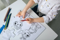 Zusammensetzen eines bunten Motivs auf der einen Seite und kreatives Ausmalen oder Spielaktivitäten auf der anderen Seite.