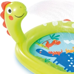 Fröhlicher aufblasbarer Pool mit Fontäne und Dinosauriermotiv, ideal für Sommerspaß im Garten. Der Pool besteht aus hochwertigem PVC-Material mit den Maßen 119 x 109 x 66 cm.