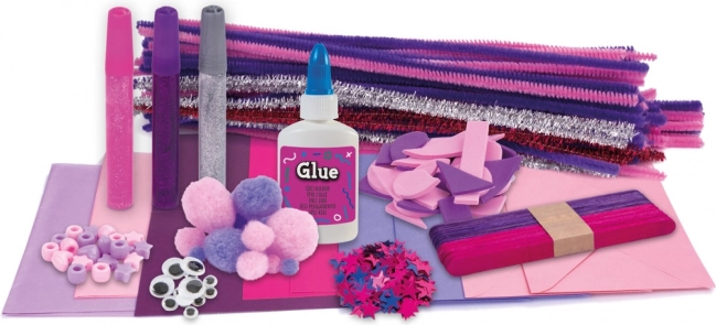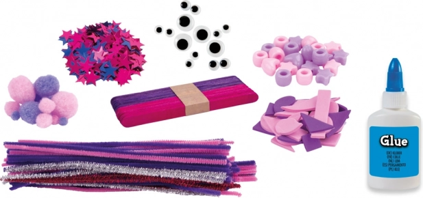 Chenilledrähte, Pompons, Schaumstoffformen, Perlen, selbstklebende Wackelaugen sowie glitzernder und klassischer Kleber – die ideale Kombination für unzählige Bastelprojekte.