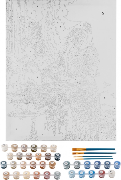 Alles Nötige in einem Paket: vorgedruckte Leinwand, 35 Farben und 4 Pinsel – einfach öffnen und ohne weitere Einkäufe losmalen.